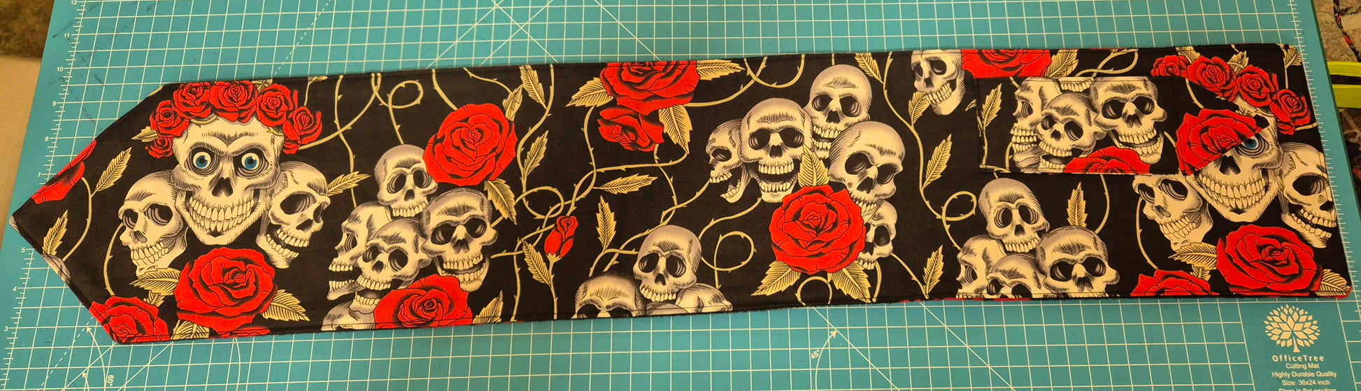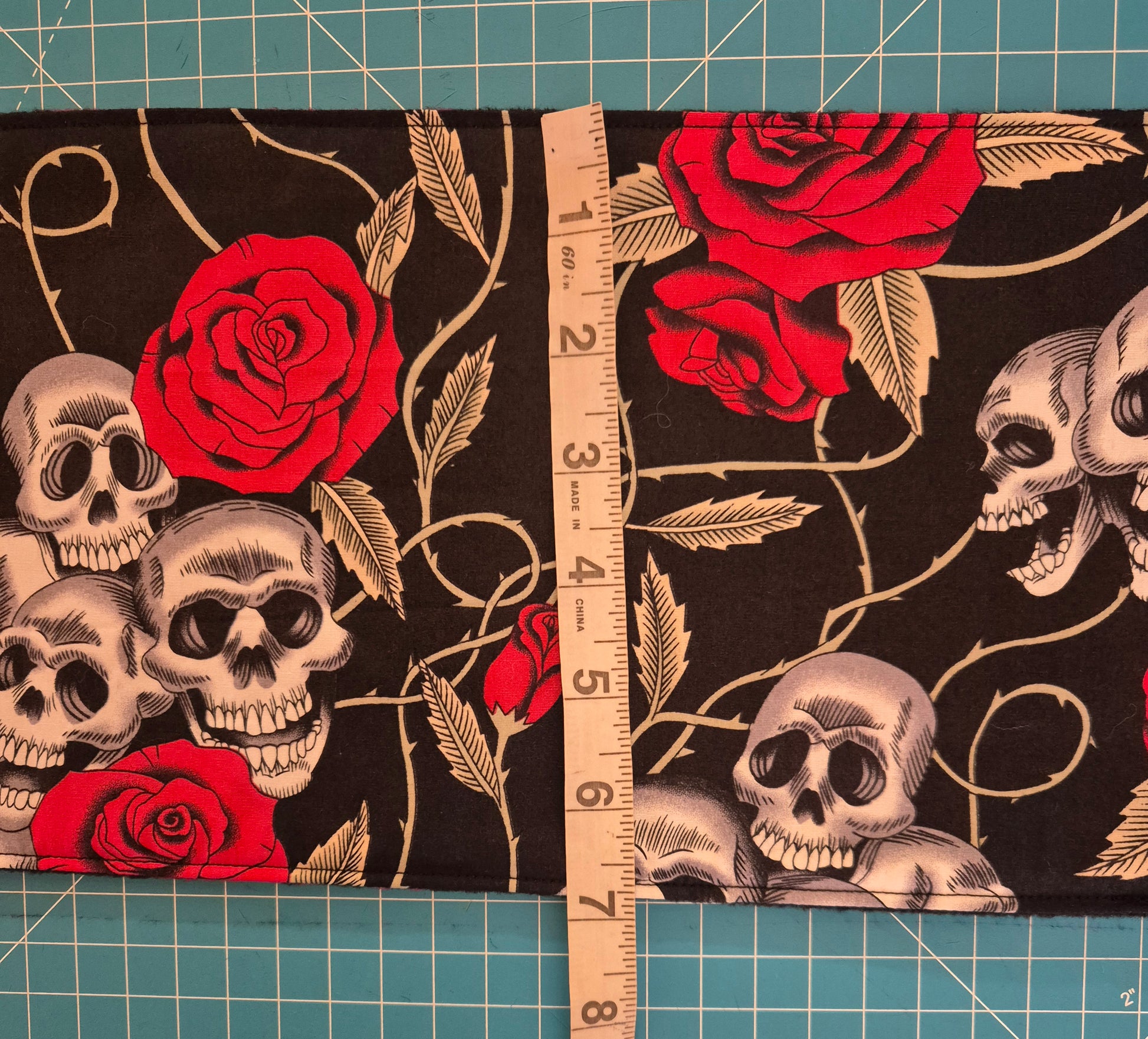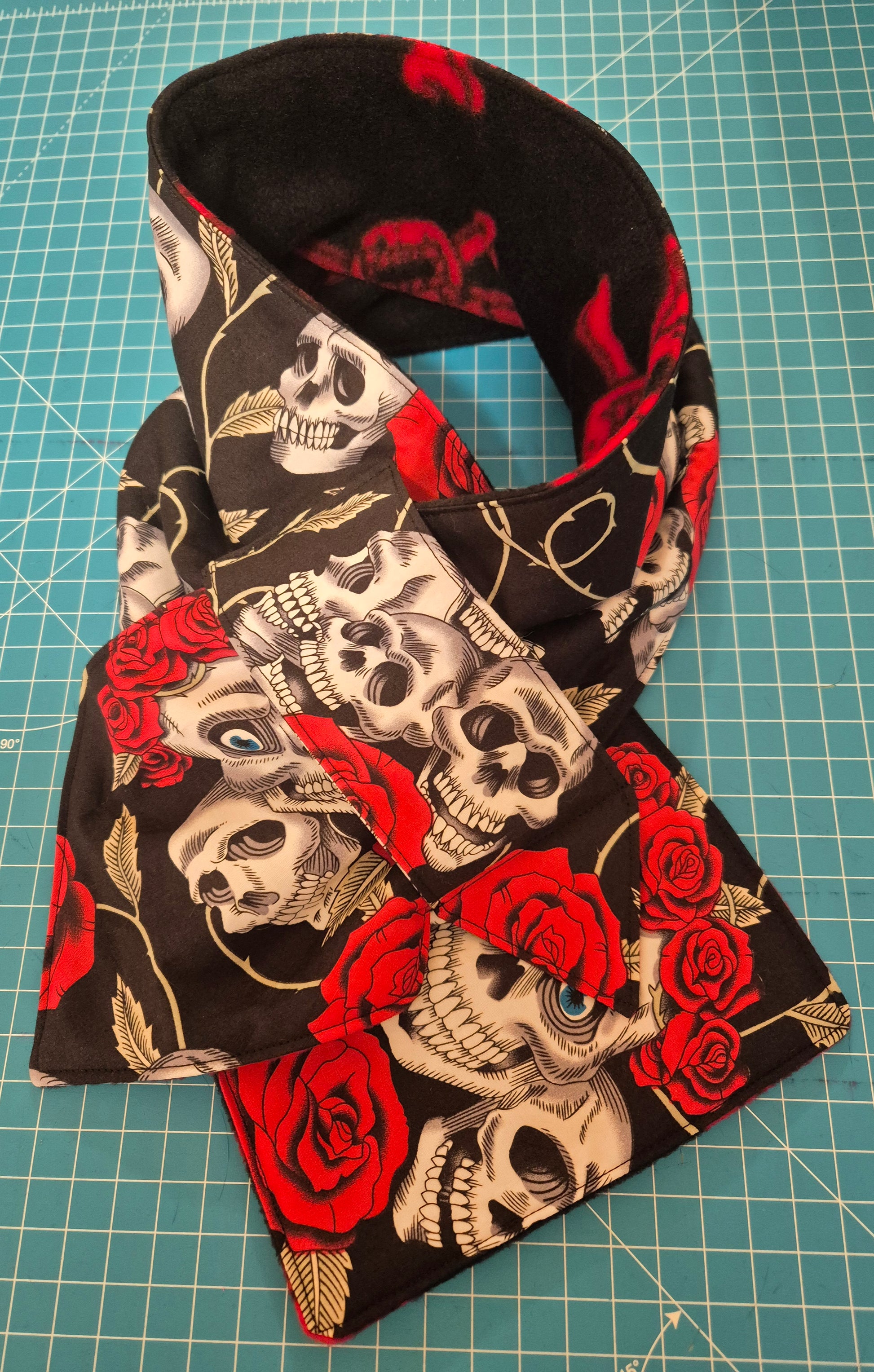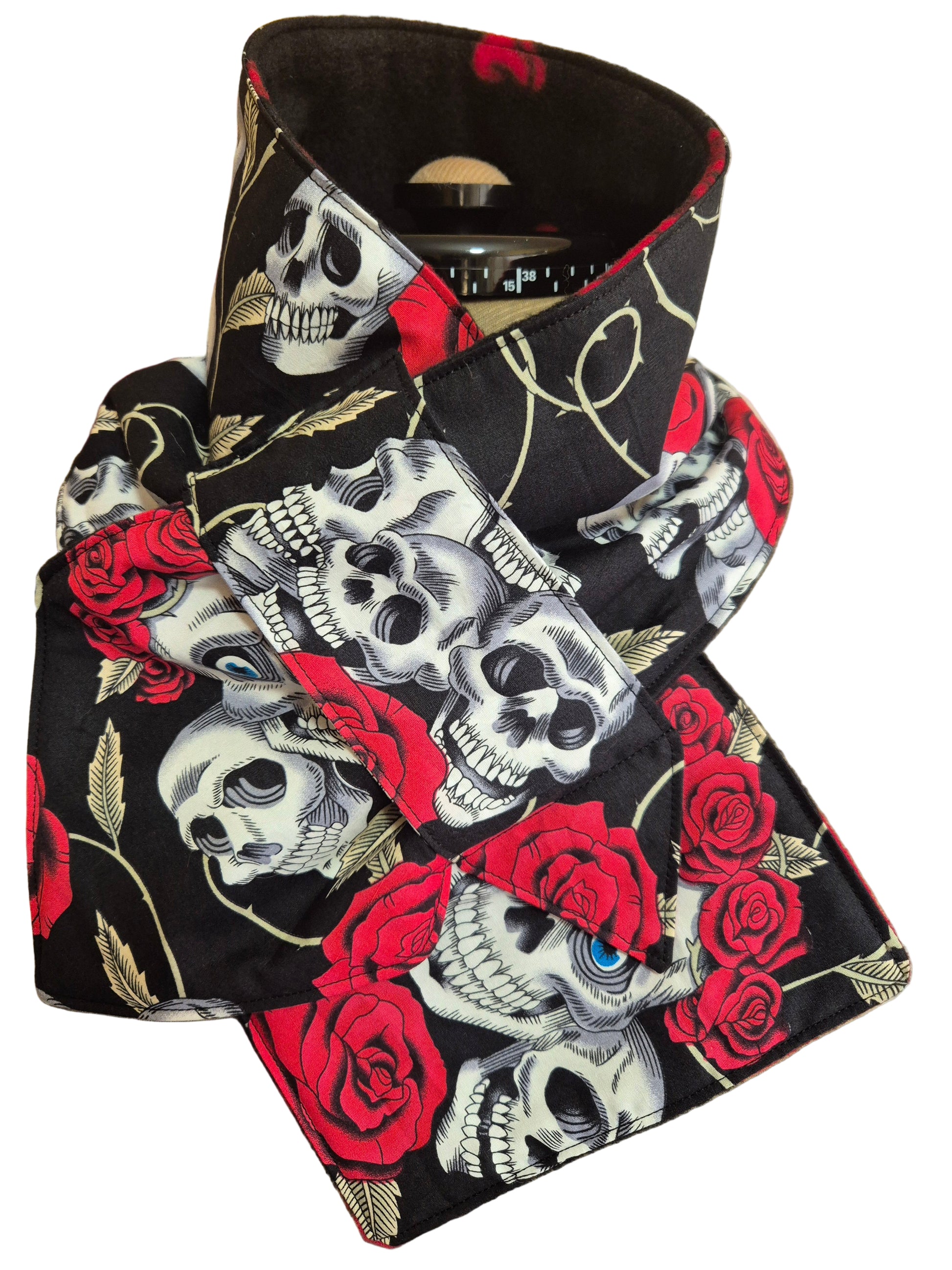 A stylish cotton skull and roses neck warmer, scarf with a black coordinating polar fleece which has a red skull and crossbones patterning and fastens with a pull-through design.