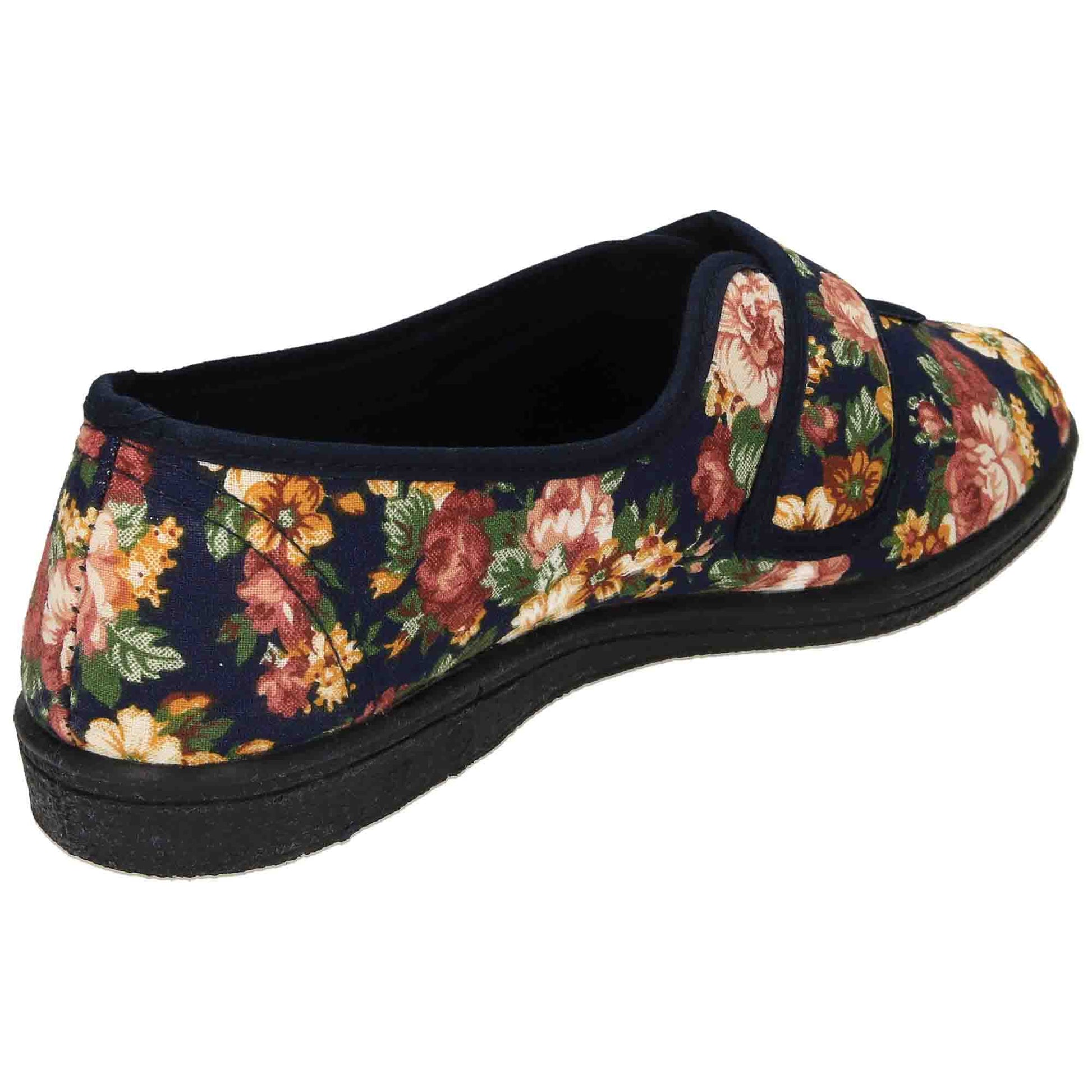 Wide Fit Washable Slippers V Opening Floral Touch Fasten Navy